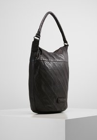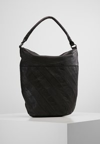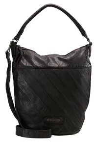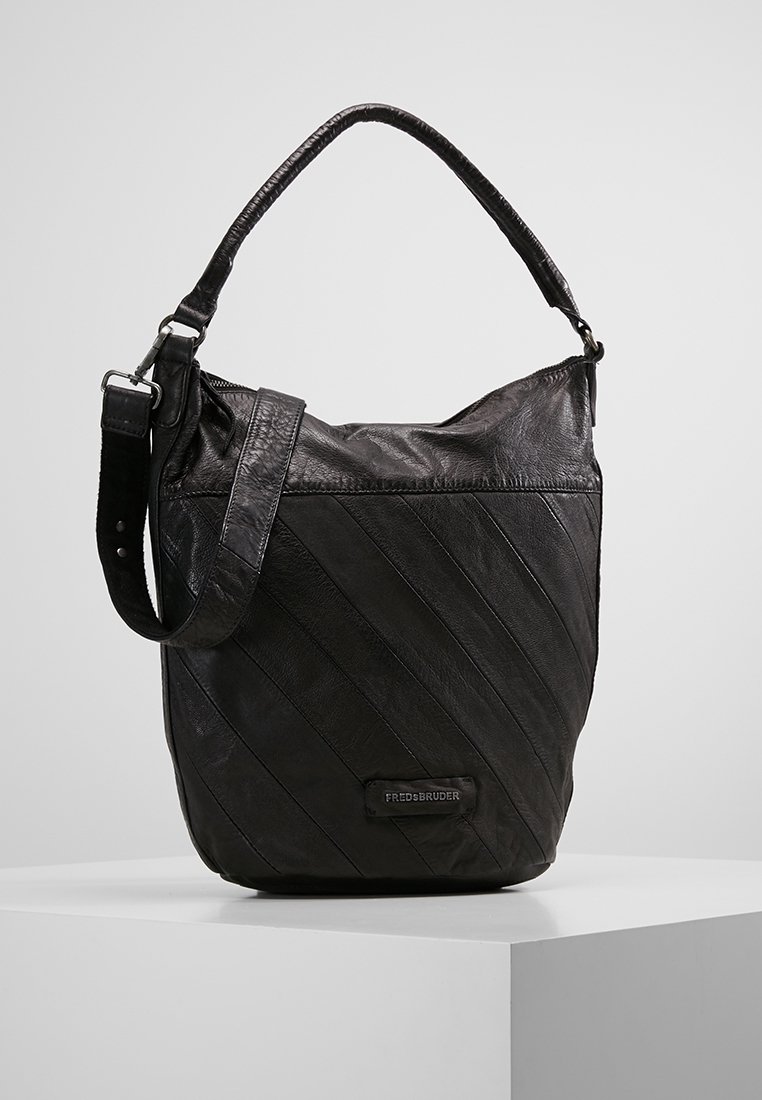 Sac seau en cuir noir avec surpiqûres en diagonale, bandoulière réglable et étiquette "FredsBruder" à l'avant, présenté sur une surface blanche.