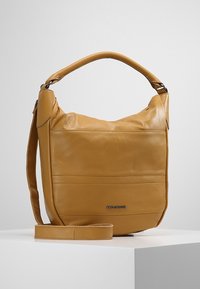 Sac à bandoulière en cuir fauve avec une poignée courte, une longue sangle réglable et un patch logo à l'avant, posé sur une surface blanche.