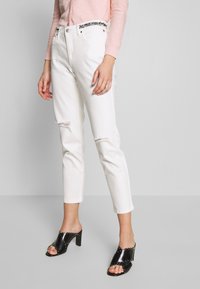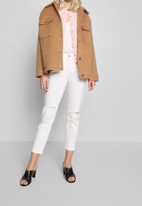 Jean blanc délavé avec une coupe droite, associé à des mules noires à talons ornées de gros clous argentés sur les bords. Cardigan rose clair.