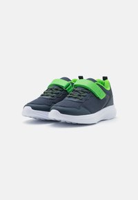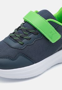 Baskets de sport bleu marine avec tige en mesh, accents vert lime, bande réglable et semelle texturée blanche. Présente des lacets contrastés.