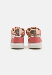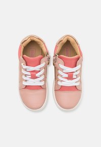 Baskets en cuir rose avec un panneau métallisé couleur or rose, lacets blancs et des coutures décoratives sur le côté. Semelle en caoutchouc.