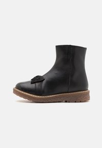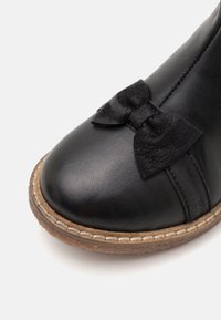Bottine en cuir noir avec un bout arrondi, ornée d'un nœud texturé à l'avant et une semelle en caoutchouc marron.