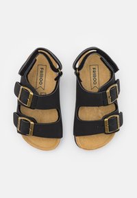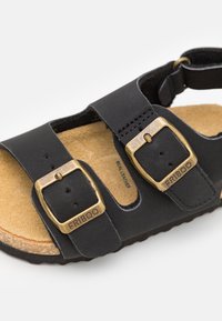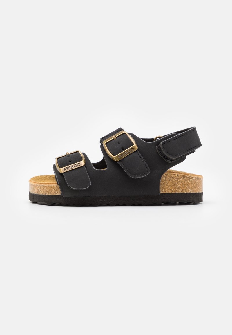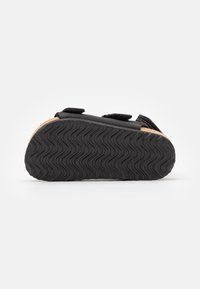 Sandale noire avec une semelle en liège, deux brides réglables avec des boucles dorées et un design minimaliste. Surface texturée et bords doux.