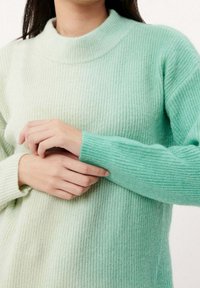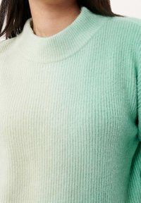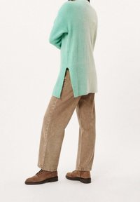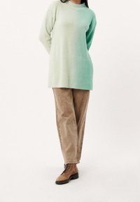 Pull en maille côtelée vert clair, pantalon en velours côtelé beige et bottes marron à lacets avec une semelle épaisse. Design simple et texturé avec une coupe décontractée.