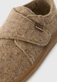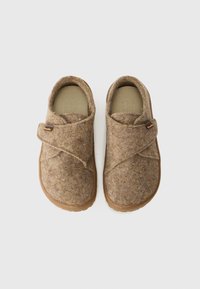 Chausson à enfiler avec dessus en feutre beige, bride réglable à scratch, et semelle en caoutchouc texturée pour une utilisation intérieure et extérieure.