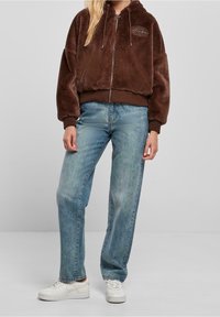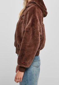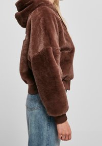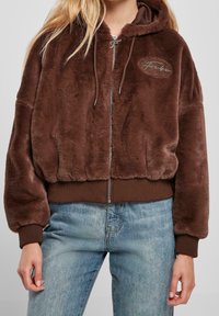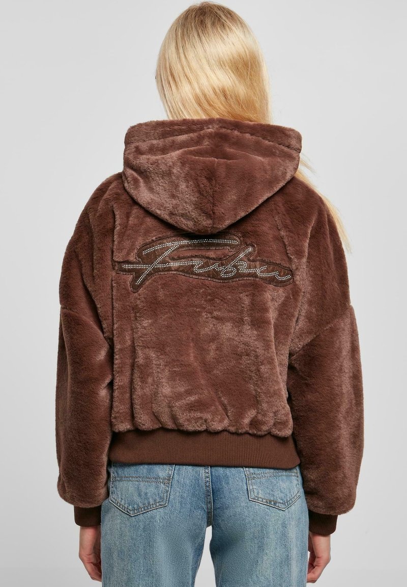 Veste à capuche en fausse fourrure marron avec texte brodé dans le dos, poignets et ceinture côtelés, portée avec un jean bleu clair.
