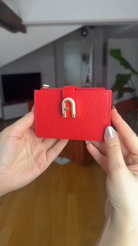 Portefeuille en cuir rouge texturé avec un compartiment zippé et un accent doré. Présente un détail de boucle verticale à l'avant.
