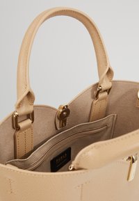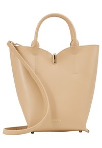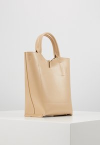 Sac à main en cuir beige avec des poignées arrondies et une longue bandoulière, posé sur une surface blanche devant un fond uni gris clair.