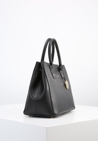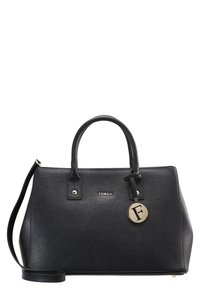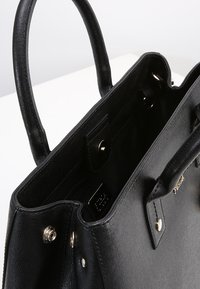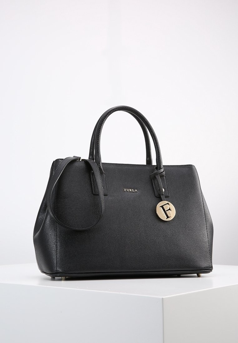 Sac à main noir en cuir avec une forme structurée, double poignée supérieure, bandoulière amovible, logo en accent doré et finition subtilement texturée.