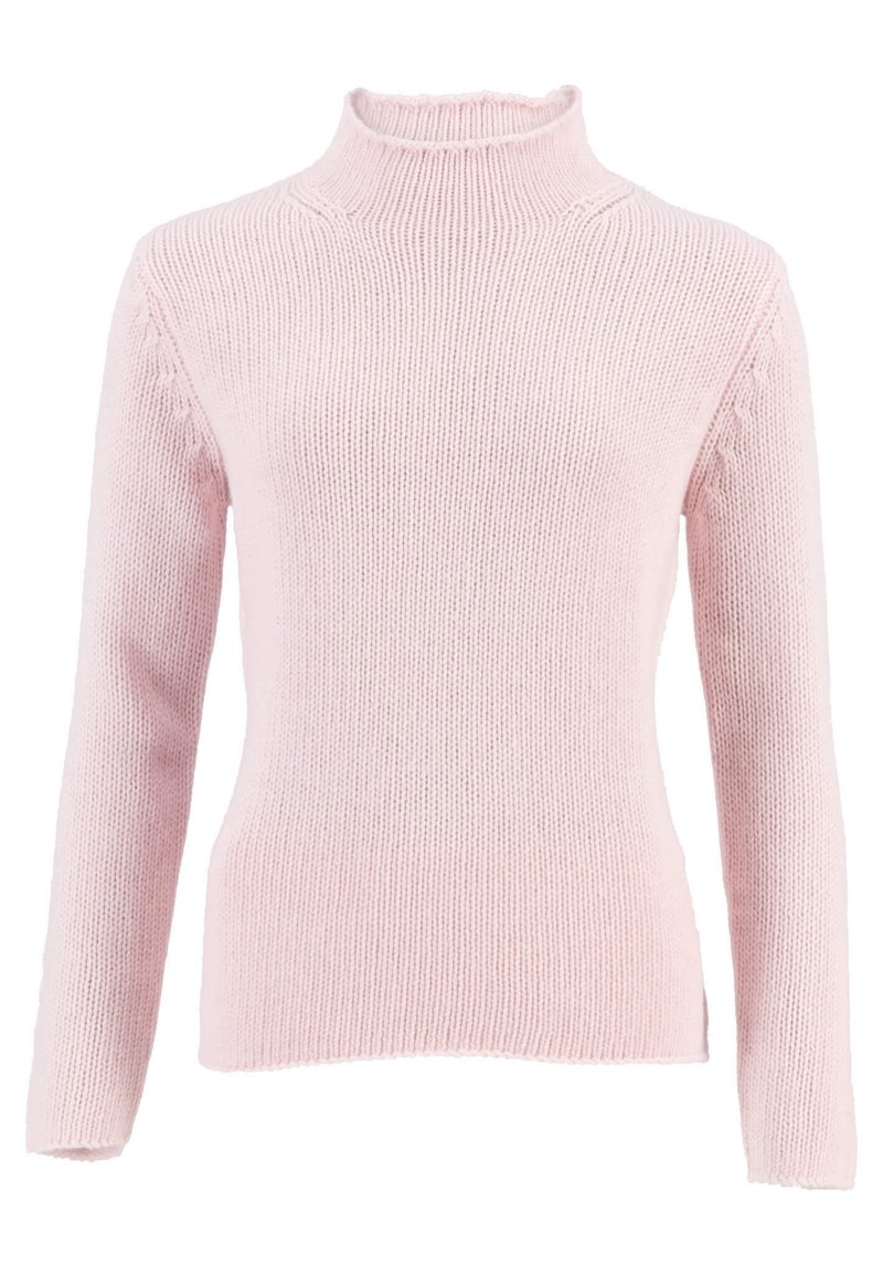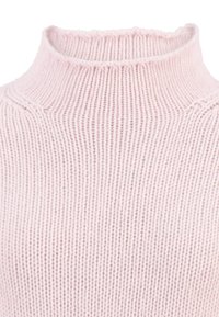 Pull rose clair en tricot avec manches longues et petit col montant, présenté de face sur un fond blanc.