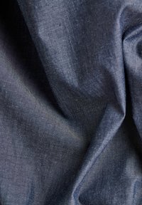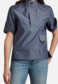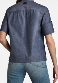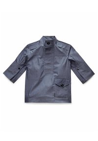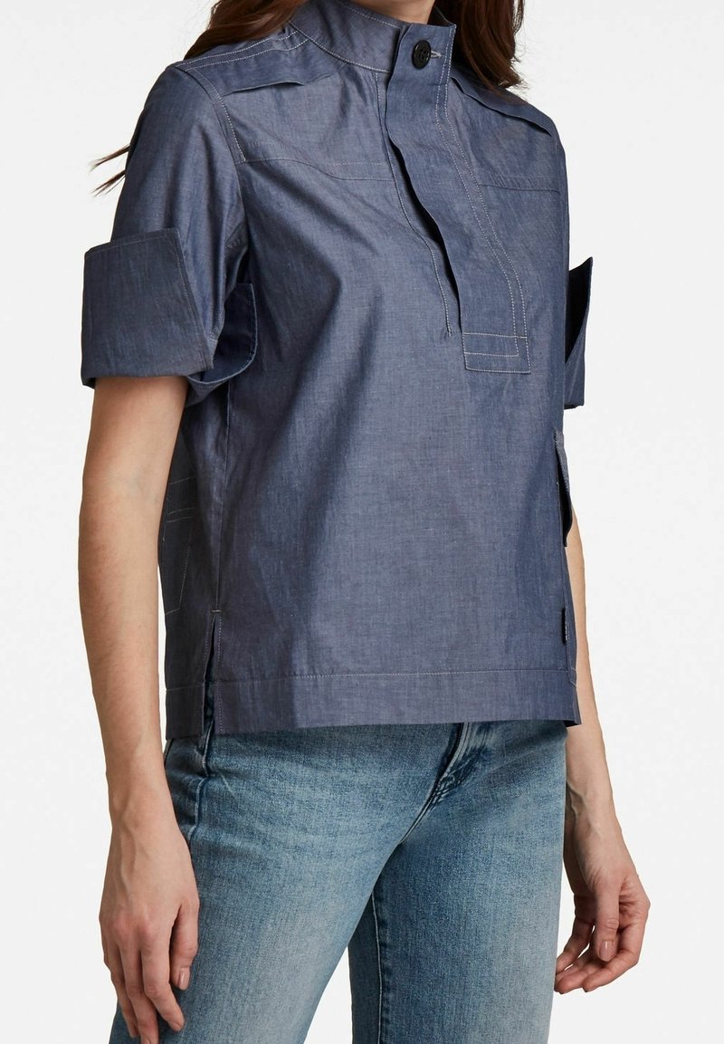 Chemise bleu foncé à manches courtes avec un col montant, une fermeture à boutons et des manches retroussées. Présente des coutures visibles et des fentes latérales.