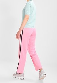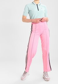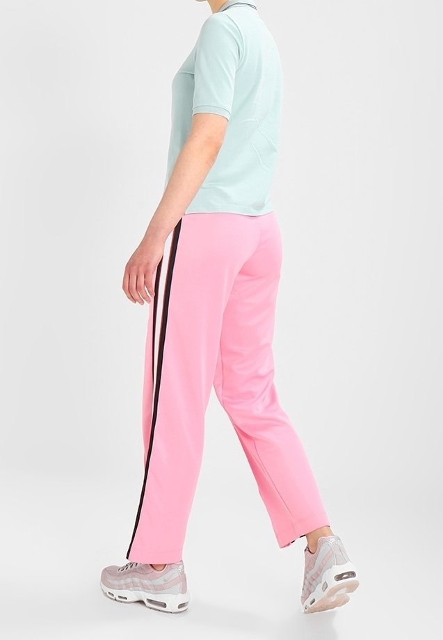 Personne portant un pantalon de survêtement rose avec des bandes noires sur les côtés, un t-shirt à manches courtes bleu clair et des baskets beige, debout de profil sur un fond blanc.