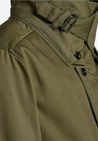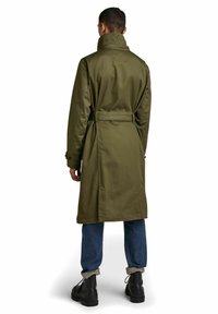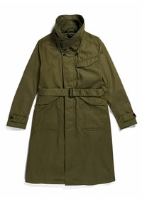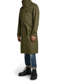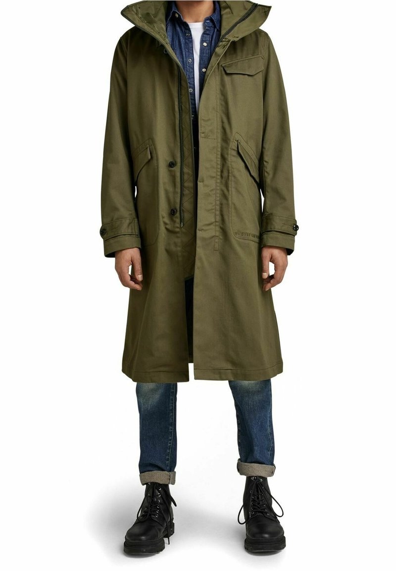 Homme portant un trench-coat à capuche vert olive, une chemise en jean bleue, un jean retroussé et des bottes noires à lacets, debout sur un fond blanc.