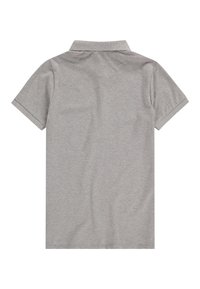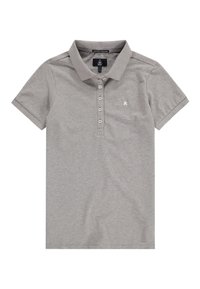Polo gris en mélange de coton, avec col, patte à quatre boutons, manches courtes et petit logo sur la poitrine.