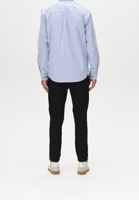 Homme portant un pantalon noir slim, une chemise bleu clair boutonnée et des baskets blanches, debout devant un fond blanc.