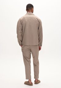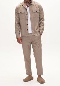Homme portant un pantalon beige, une veste assortie, une chemise blanche et des chaussures beige à enfiler, sur un fond clair uni.