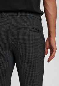 Pantalon slim ajusté à carreaux noirs avec un tissu texturé, doté de poches latérales, d'une fermeture avant à boutons et d'ourlets revers. Porté avec des chaussures noires.