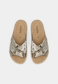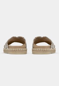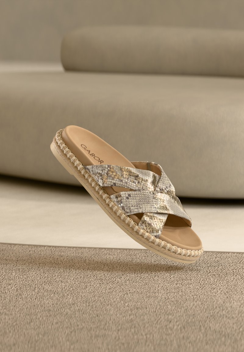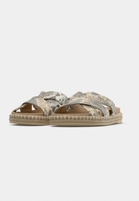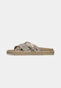 Sandale plate à enfiler beige et or avec des brides croisées, en matière synthétique texturée, semelle plate et semelle intérieure rembourrée. Logo de la marque à l'intérieur.