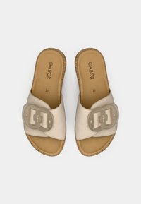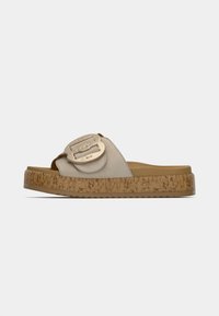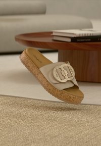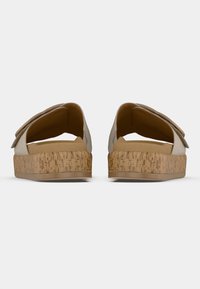 Sandale à glissière beige avec une large bride ornée d'une boucle de couleur dorée. Semelle plateforme à texture de liège avec une base en caoutchouc marron clair.