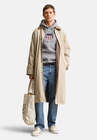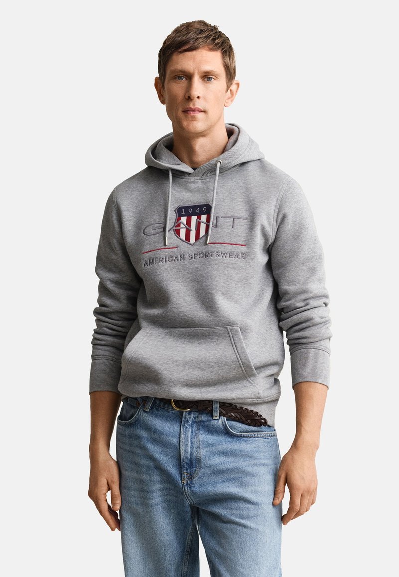 Homme portant un sweat à capuche gris avec un logo en bouclier et le texte « GANT American Sportswear », associé à un jean bleu clair et une ceinture tressée.