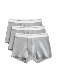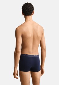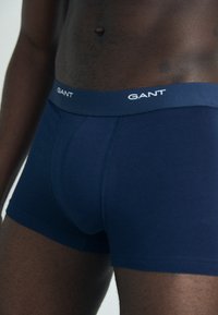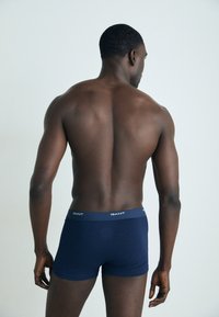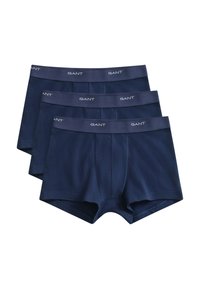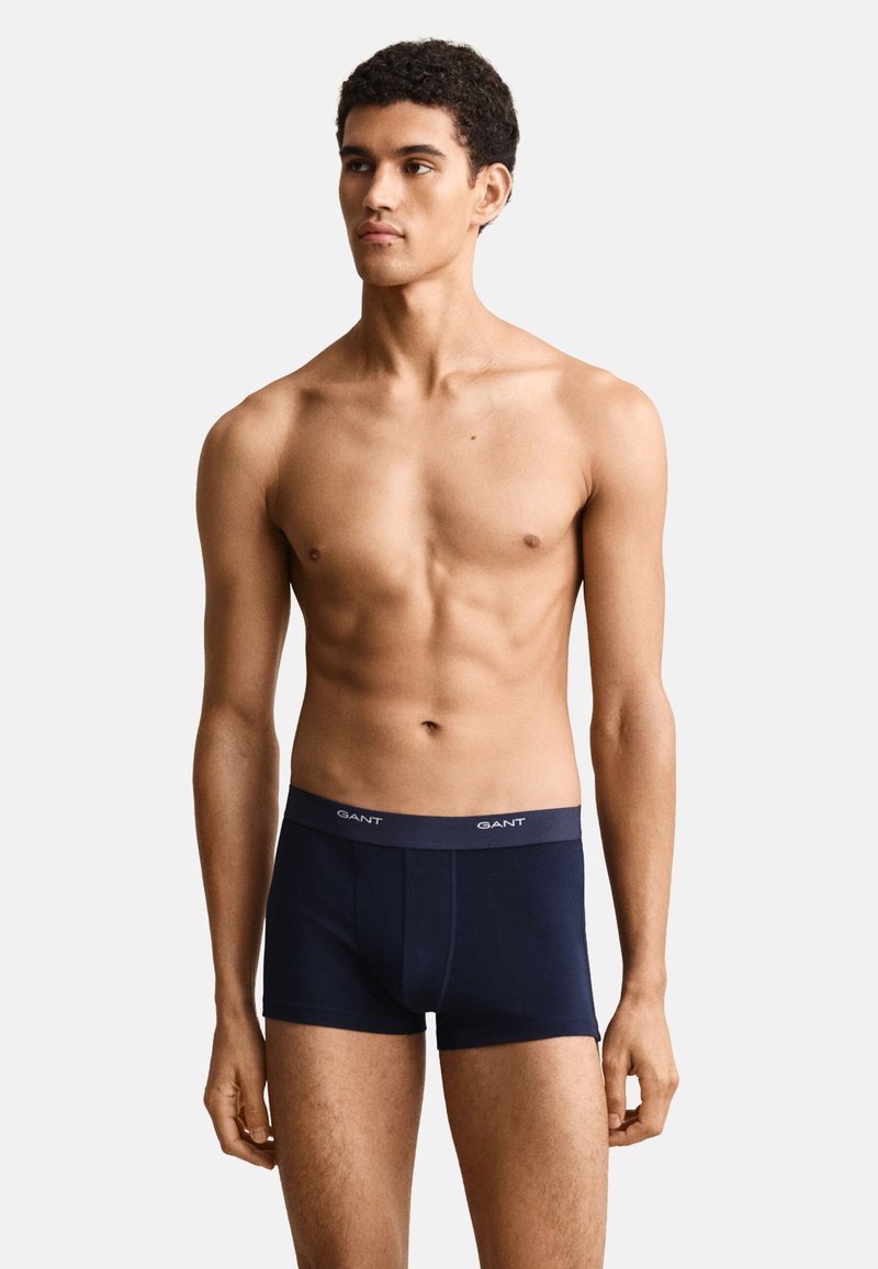 Jeune homme portant un boxer bleu marine GANT, debout devant un fond clair uni, regardant sur le côté.