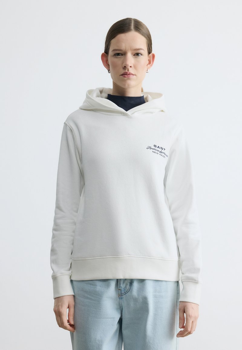Femme portant un sweat à capuche blanc GANT avec logo sur la poitrine et jean bleu clair, debout devant un fond clair uni.