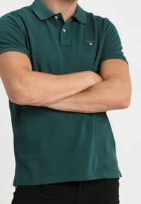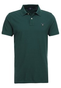 Polo shirt vert foncé avec un col, des manches courtes et le logo GANT sur la poitrine. Tissu en coton doux avec une texture unie et sans motifs.