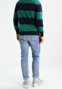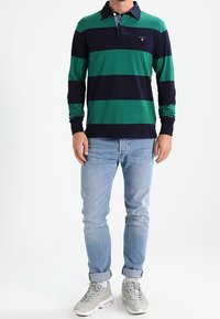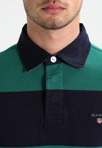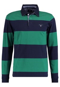 Polo à manches longues avec des rayures horizontales vertes et marines, col classique et un petit logo sur la poitrine.