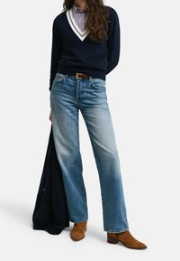 Femme portant un pull col V bleu marine à bordure blanche sur une chemise rayée, jean bleu clair avec ceinture marron, et cheveux longs ondulés.