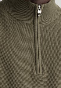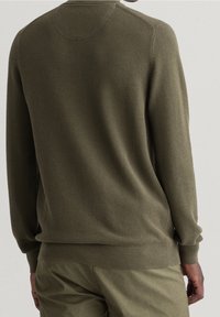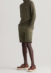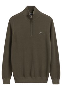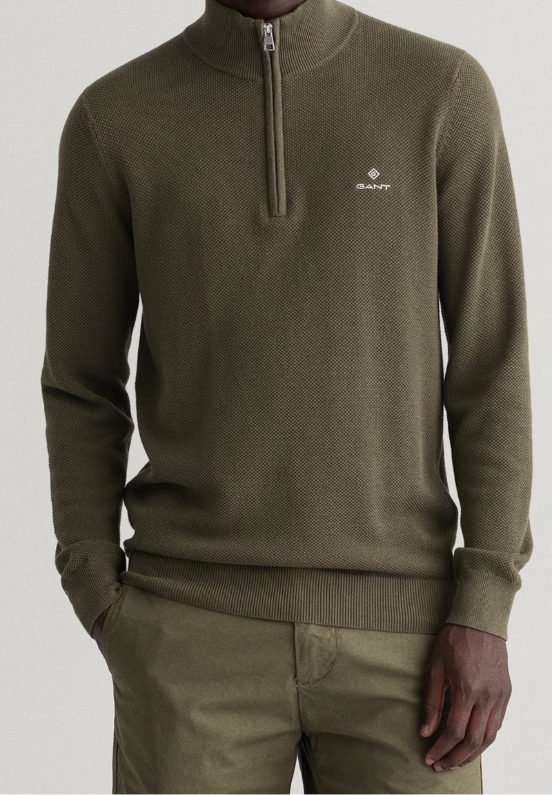Homme portant un pull texturé vert olive à demi-fermeture éclair avec le logo GANT et un pantalon assorti vert olive, les mains dans les poches.