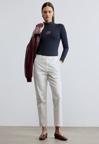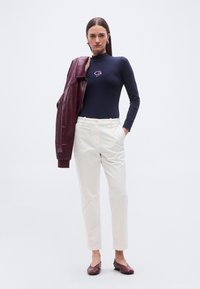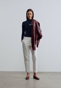 Femme portant un pantalon blanc à jambes droites, un haut à manches longues bleu marine et des chaussures plates bordeaux, debout sur un sol gris devant un mur uni.