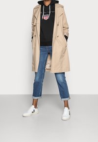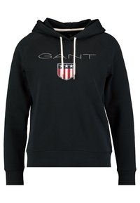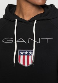 Sweat à capuche noir avec cordons blancs, texte "GANT" et emblème de bouclier rouge, blanc et bleu porté avec un jean bleu sur une personne.