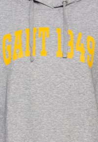 Sweat à capuche gris clair à manches longues avec le texte jaune « GANT 1949 » en lettres audacieuses et arquées sur la poitrine.