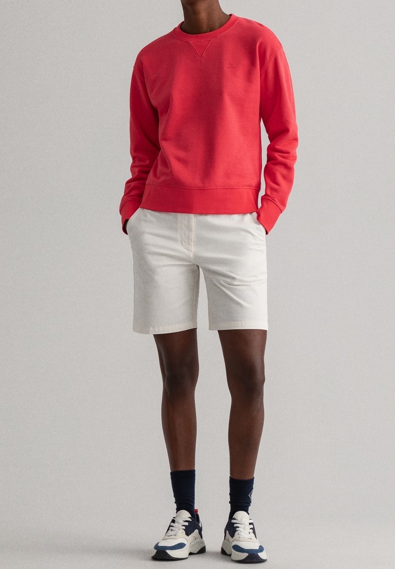 Personne portant un sweat-shirt rouge vif à manches longues, un short blanc cassé jusqu'aux genoux, des chaussettes foncées et des baskets blanches avec des accents bleus, debout les mains dans les poches.