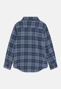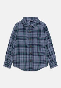 Chemise à manches longues à carreaux bleu, vert et noir, avec col et deux poches poitrine.