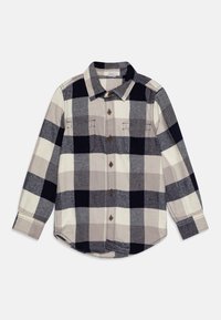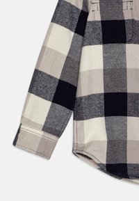 Chemise à carreaux noir, blanc et gris à manches longues, boutonnée avec col et deux poches poitrine, posée à plat sur un fond clair.