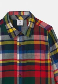 Chemise à manches longues pour enfant avec motif à carreaux rouge, jaune, vert, bleu et blanc, et col pointu.