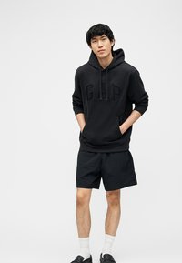 Jeune homme portant un sweat à capuche noir avec "GAP" en relief sur le devant et un short noir, debout devant un fond clair uni.