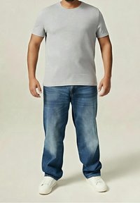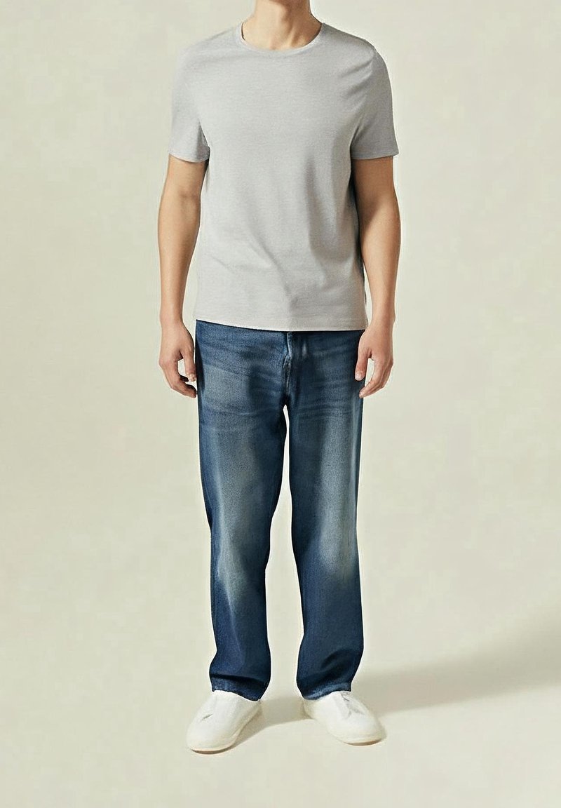 T-shirt gris en coton à col rond associé à un jean droit bleu délavé et des chaussures blanches sans lacets. Tenue simple et décontractée avec des lignes épurées.