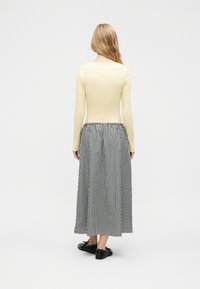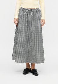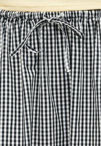 Personne portant une jupe-pantalon large en vichy noir et blanc avec une taille à cordon, un haut ivoire à manches longues et des mocassins noirs, debout sur un fond blanc.