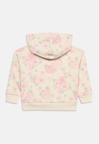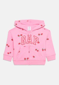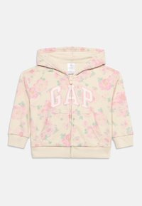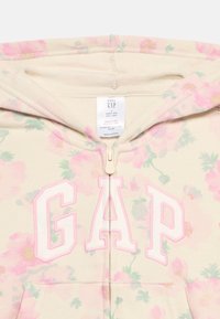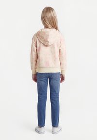 Jeune fille aux longs cheveux blonds portant un sweat à capuche GAP tie-dye pastel, un jean bleu et des chaussures blanches à enfiler, debout et souriante.