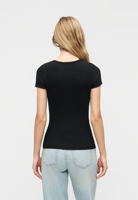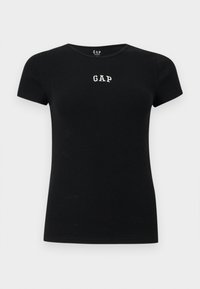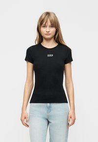 Jeune femme aux cheveux bruns clairs et raides, portant un T-shirt noir ajusté avec l'inscription "GAP" et un jean bleu clair, se tenant devant un fond uni.