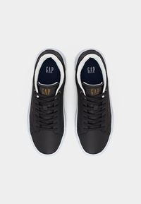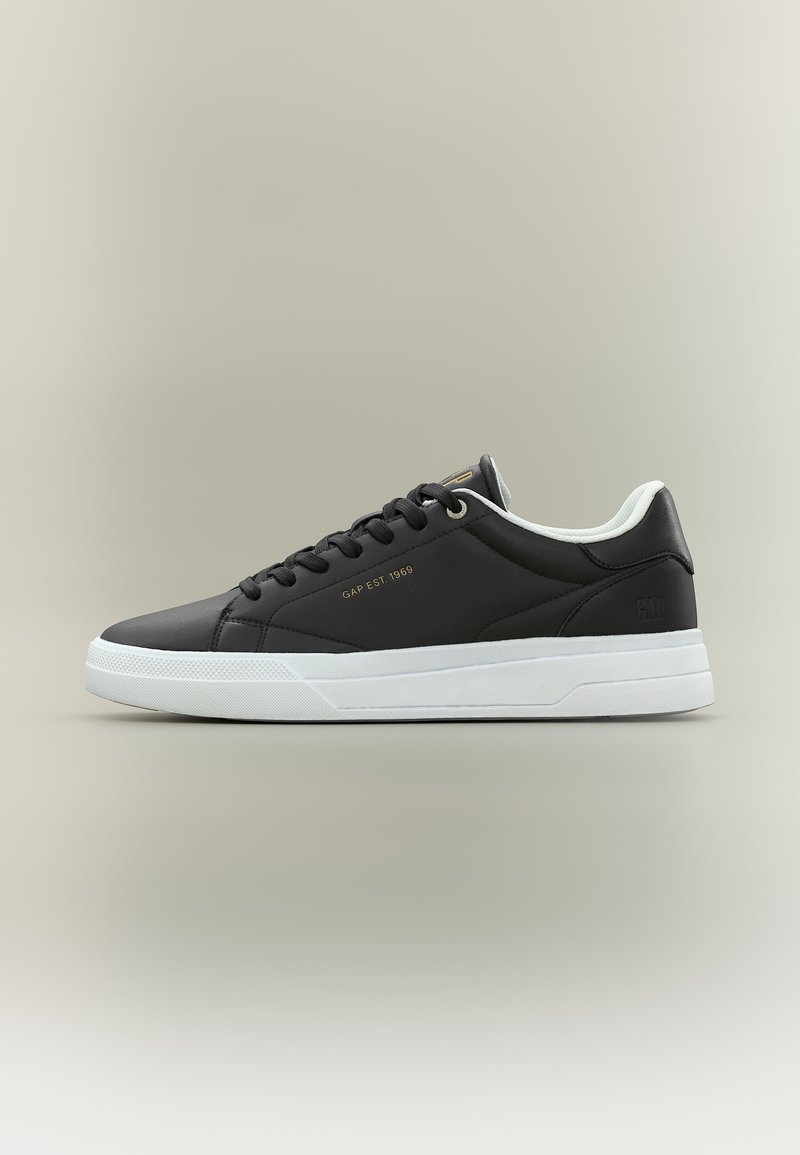 Baskette basse noire avec semelle blanche, lacets noirs, et inscription "GAP EST. 1969" en lettres dorées sur le côté.