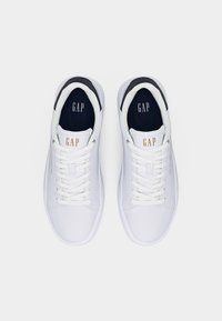 Baskets blanches basses avec lacets blancs, empiècement noir au talon et texte doré "GAP EST. 1969" sur le côté, posées sur un fond neutre.