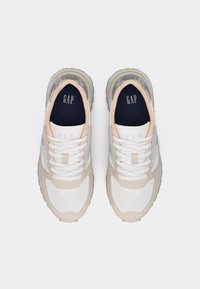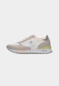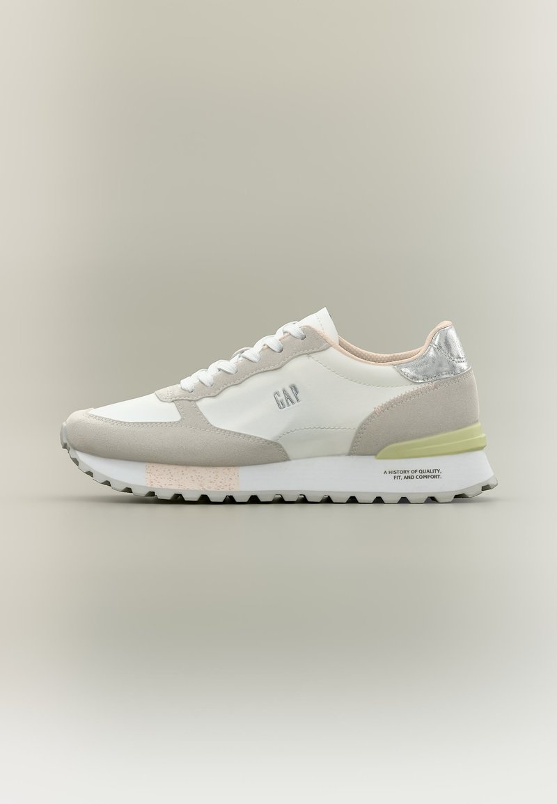 Baskets décontractées blanches et beiges avec une semelle grise, un accent talon argenté, le logo "GAP" sur le côté et une semelle extérieure rainurée sur un fond neutre.