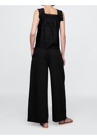 Haut sans manches noir avec des détails brodés et des bretelles froncées, associé à un pantalon large taille haute noir et des sandales plates.