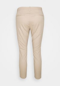 Pantalons en coton beige avec une coupe slim, présentant une taille plate, deux poches latérales et des détails cousus sur les coutures.
