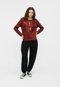 Personne portant un pantalon noir ample avec des poignets élastiques, des baskets noires et blanches, et un haut manches longues couleur rouille, debout sur un fond uni.