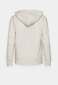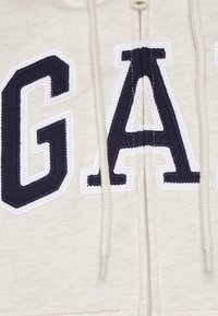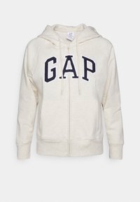 Sweat à capuche crème à fermeture éclair avec capuche à cordon, arborant un grand logo "GAP" bleu marine. Matière douce, poches avant et poignets côtelés.