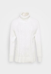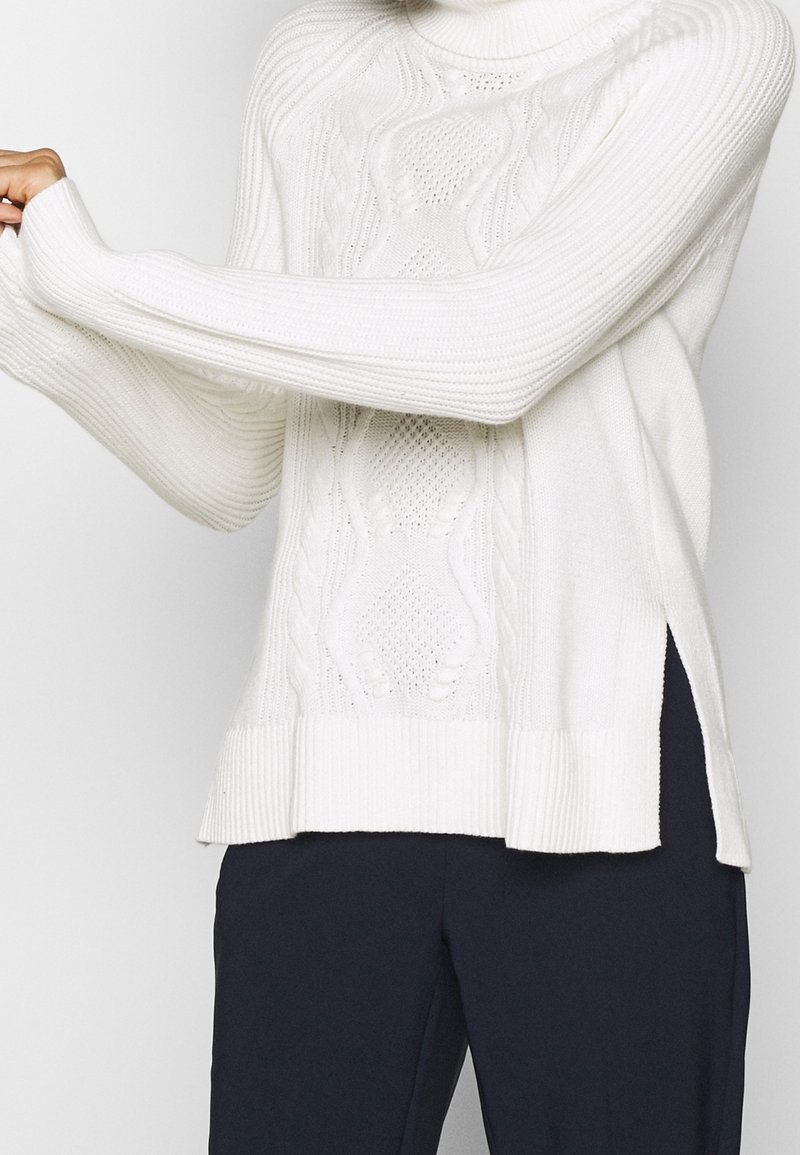 Pull blanc en maille avec un col montant, des poignets côtelés et des fentes sur les côtés. Texture comprenant des motifs en torsades sur tout le corps.